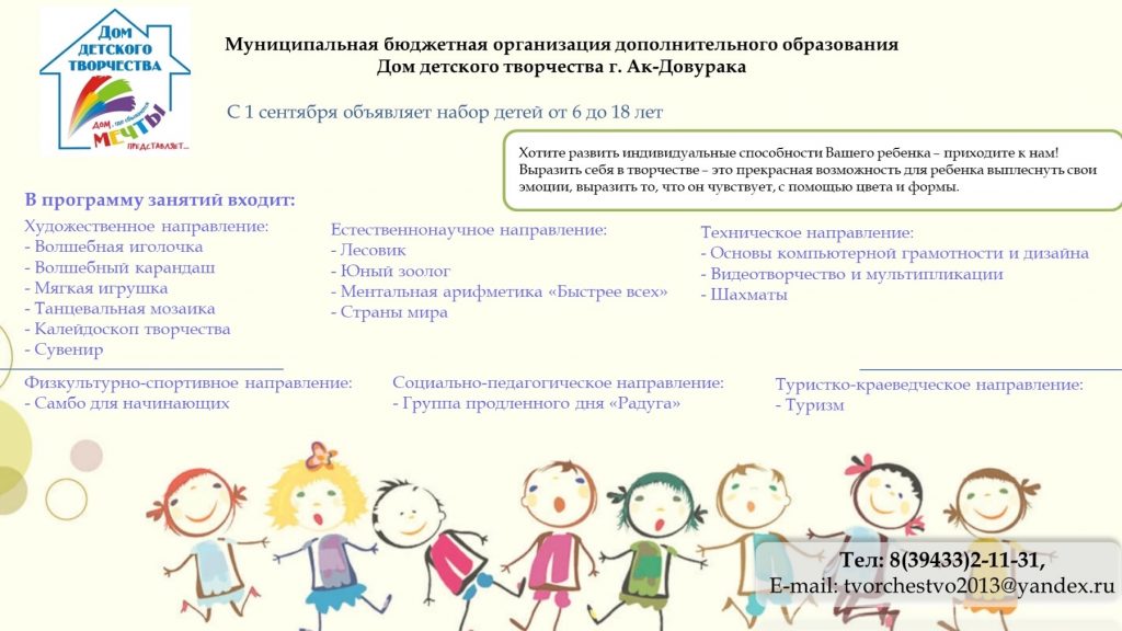 Мы рады приветствовать вас на официальном сайте нашей организации. Сайт адресован всем, кому интересно знать, чем живет наше образовательное учреждение. Он создается для Вас, уважаемые Родители, любимые Ученики и Педагоги, просто Гости сайта. Дом детского творчества – уникальная организация дополнительного образования — ведь это дом Успеха: мы не боремся с недостатками, мы развиваем достоинства. Это школа равных, но разнообразных возможностей.